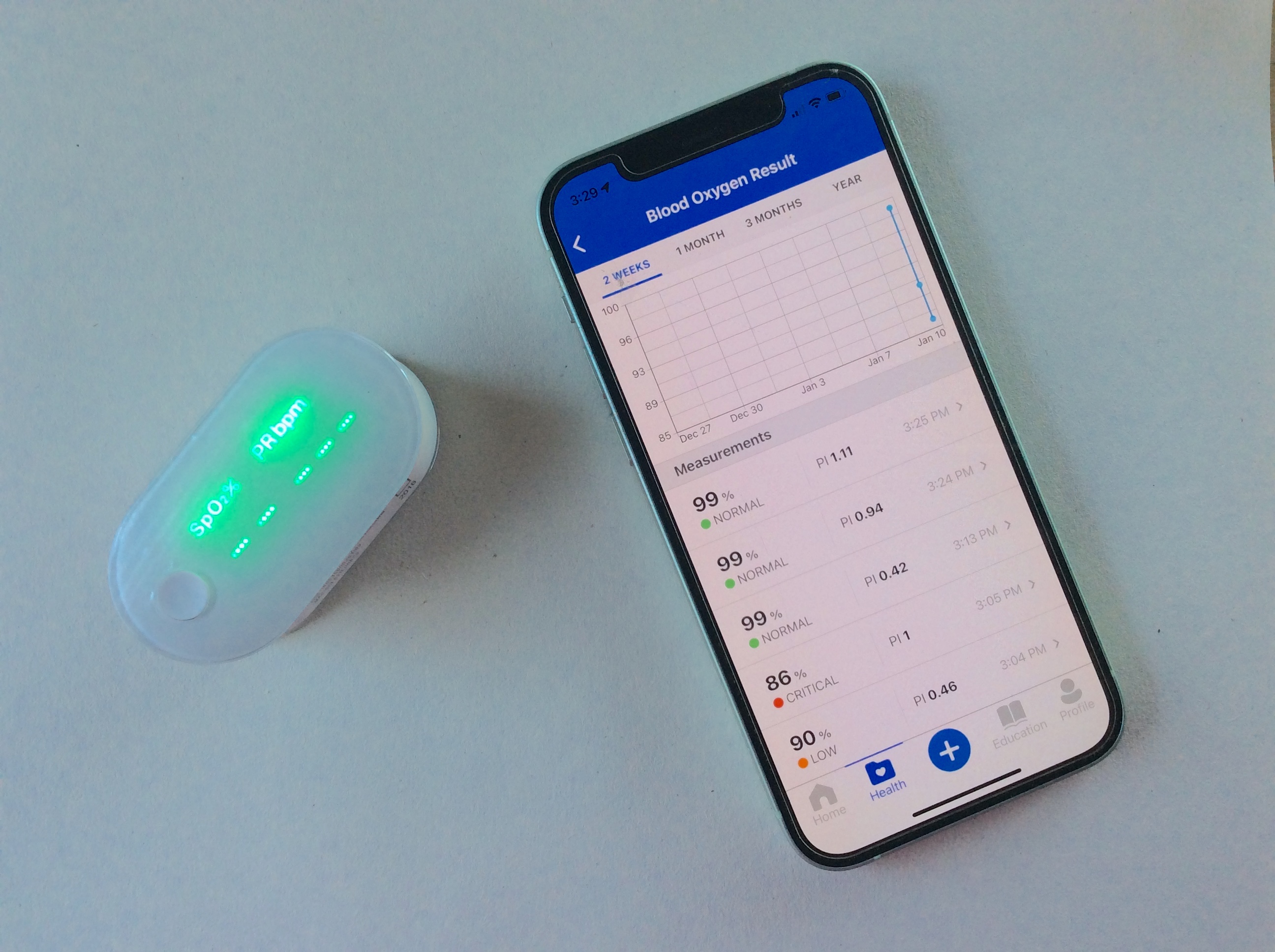 注意:大多數關於血氧水平和風險的指導基於持續監測血氧飽和度。然而,iHealth血氧儀僅設計用於家庭SpO2監測和隨機檢查。因此,家庭監測無法替代急診室的護理或肺病專家的建議。如果您對結果感到擔憂,請不要嘗試解釋它們。如果您對自己的病情或讀數有任何疑問,請與您的肺病專家或常規醫生交談。始終在進行測量時遵循最佳實踐,以確保您的讀數準確。SpO2低於80-85%可能會導致大腦/器官損傷。如果您有任何低血氧的症狀,請務必與您的提供者交談。