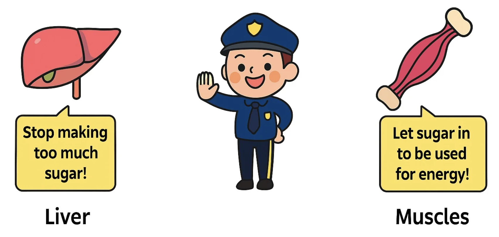 Normally, the liver makes sugar to help keep energy levels stable between meals and overnight. However, when a person has type 2 diabetes, the liver often makes too much sugar – this can make blood sugar harder to control. Metformin, which belongs to a class of drugs called biguanides, helps lower blood sugar by telling the liver to make less sugar. Metformin has the added benefit of making muscle and fat in the body more sensitive to insulin, helping to bring blood sugar down more efficiently after meals.