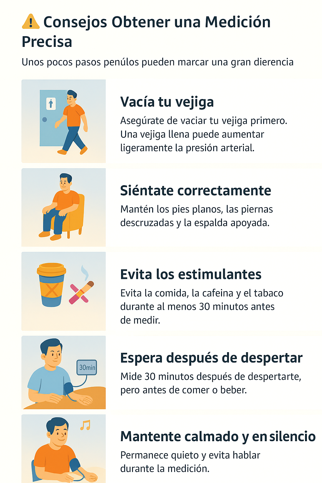 - No esperar después de la medicación: Los medicamentos para la presión arterial generalmente necesitan de 1 a 2 horas para funcionar completamente después de tomarlos. Medir demasiado pronto puede dar una lectura artificialmente alta.