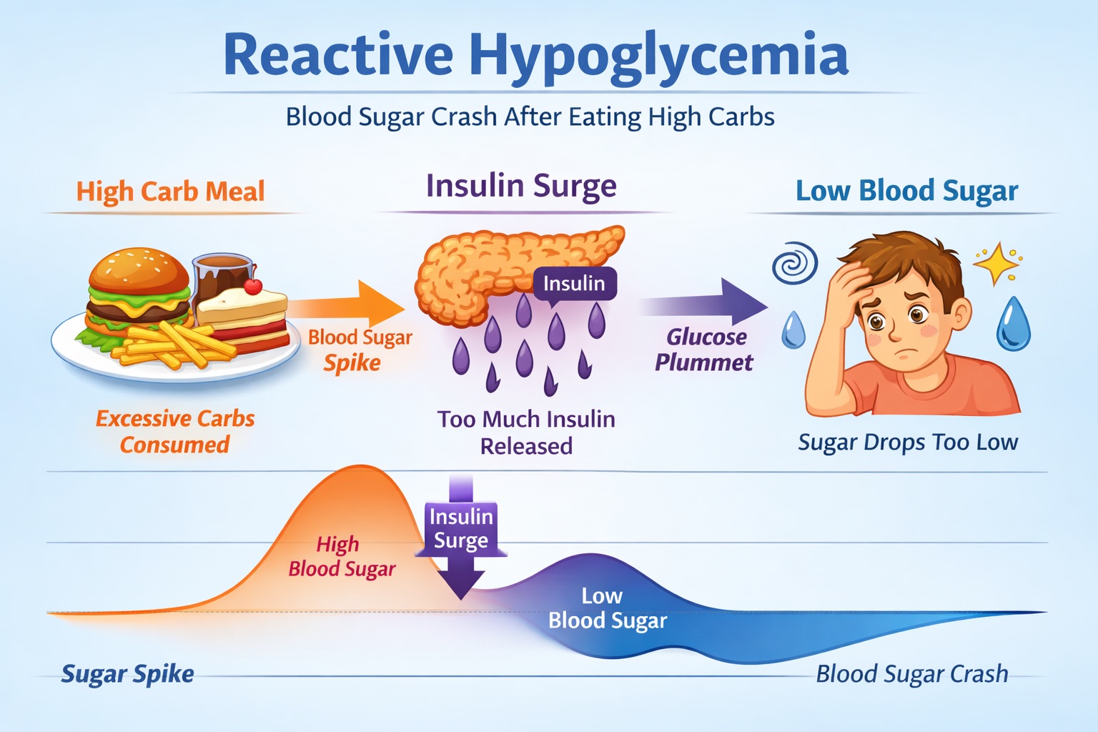 Reactive hypoglycemia is a drop in blood sugar (<70 mg/dL) that occurs about 1–4 hours after eating or drinking something high in refined carbohydrates or added sugars.