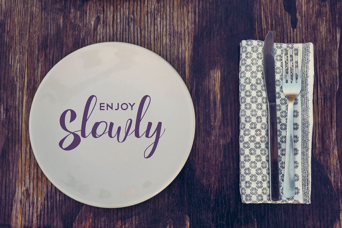 - Slow down and notice your hunger cues. Put your fork down between bites.